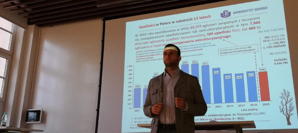 Paweł Antonowicz – na temat skali i intensyfikacji procesów upadłościowych i restrukturyzacyjnych przedsiębiorstw w Polsce – podczas wykładu dla słuchaczy SGH w Warszawie, marzec 2020
